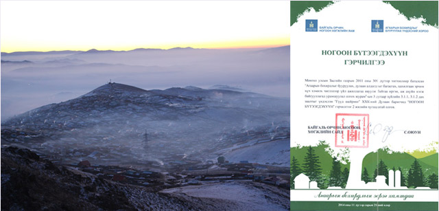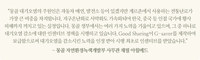 게르촌 굴뚝에서 나오는 연기는 울란바토르의 대기오염의 주된 원인입니다. 겨울에 더욱 극심해지는 대기오염으로 인해 실제로 울란바토르의 인구 24%가 호흡기질환을 앓고 있습니다. 뿐만 아니라 500미터 거리의 건물도 불빛 없이는 파악하기 힘들 정도로 공기가 탁합니다. G-saver는 연료 효율성을 증가시켜 가정 내 석탄 사용량을 줄였고, 이는 대기의 이산화탄소와 일산화탄소의 감소 효과를 가져왔습니다. 이에 G-saver는 지난 11월 몽골 대기오염감소위원회로부터 ‘녹색제품 인증’을 받기도 했습니다.