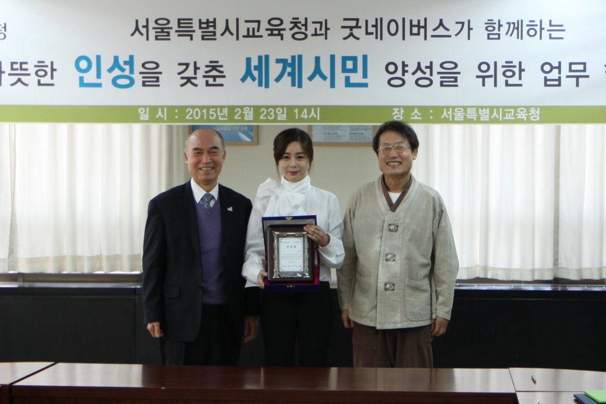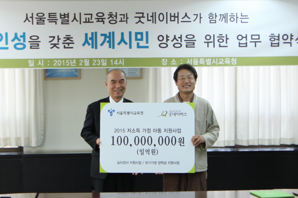 협약식은 이일하 굿네이버스 회장과 조희연 서울시교육청 교육감, 서영희 굿네이버스 홍보대사가 참석한 가운데 진행됐다. 이날 두 기관은 서울시 학생과 교직원 및 학부모가 굿네이버스 교육과 심리정서․위기가정지원 사업에 적극 참여할 수 있도록 협력을 약속했다. 또한, 굿네이버스는 저소득가정 아동을 대상으로 장학금 지원 및 심리상담․치료 등을 위한 1억 원을 전달했다.