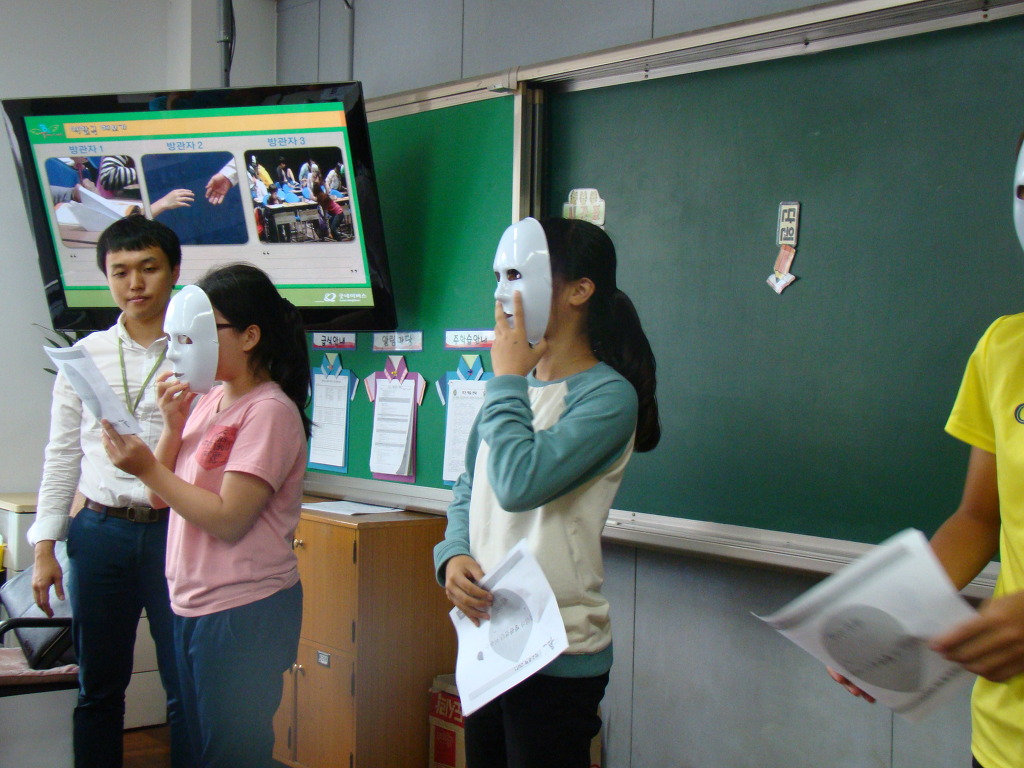 예방교육에 참여한 학생들이 역할 가면극을 통해 학교폭력 문제를 이해하고 있다.