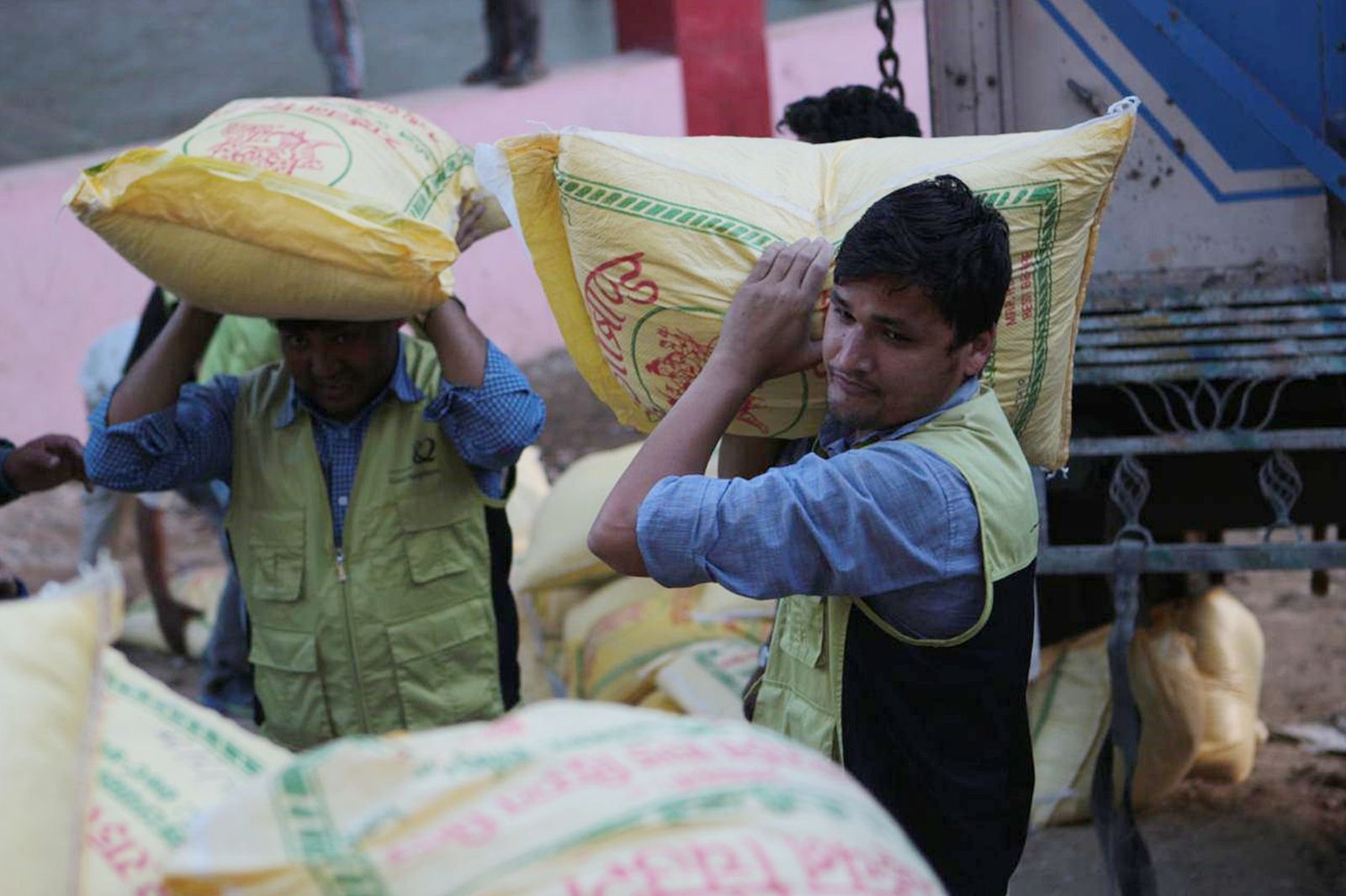 네팔 지진 진앙지인 고르카 지역에서 구호물품으로 전달할 쌀 포대를 나르고 있다.