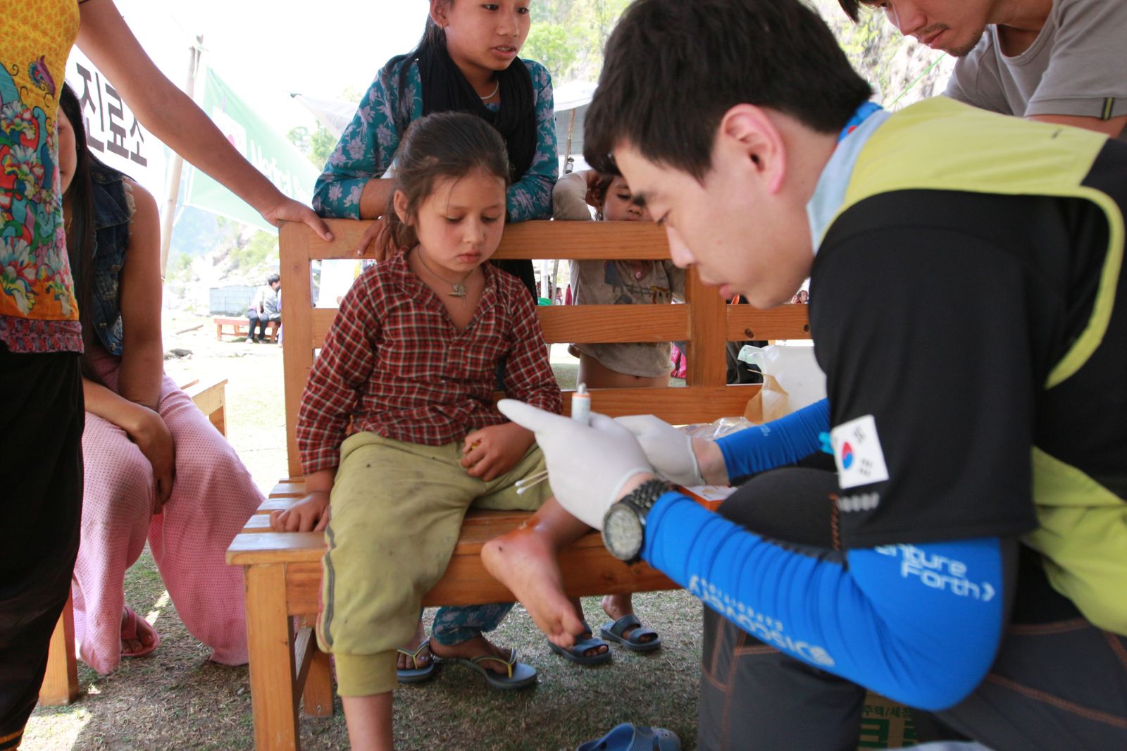 접근이 어려운 고르카 산간마을 주민 대상으로 이동 진료소를 통한 의료구호활동을 진행하는 모습.
