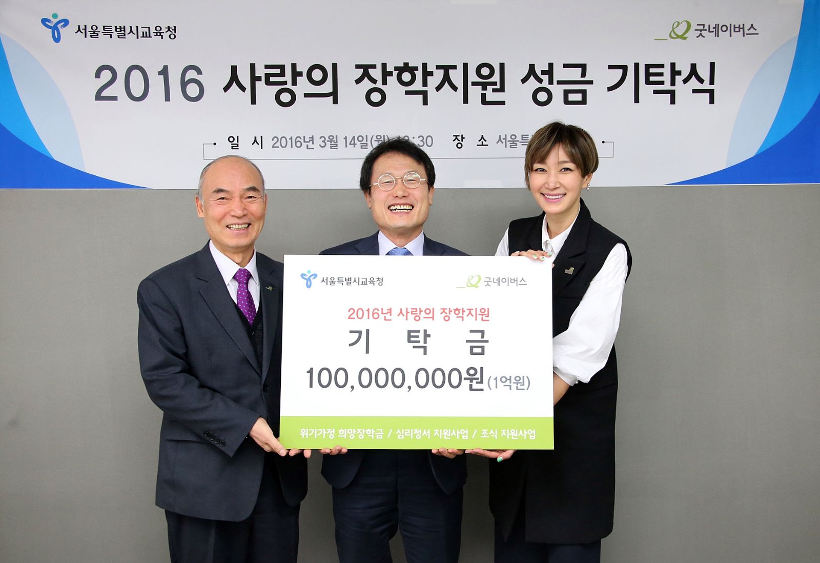 기탁식에는 이일하 굿네이버스 회장과 조희연 서울시교육청 교육감, 변정수 굿네이버스 홍보대사가 참석했다. 이날 굿네이버스는 저소득가정 아동에게 장학금, 심리상담·치료 지원 등의 복지 프로그램을 지원하는 장학금 1억 원을 서울시교육청에 전달했다. 또한 두 기관이 함께 굿네이버스 세계시민·인성교육 프로그램 ‘좋은마음 인성학교’ 사업을 진행해 서울시 학생들의 나눔 문화와 올바른 인성 함양을 위해 협력키로 약속했다.
