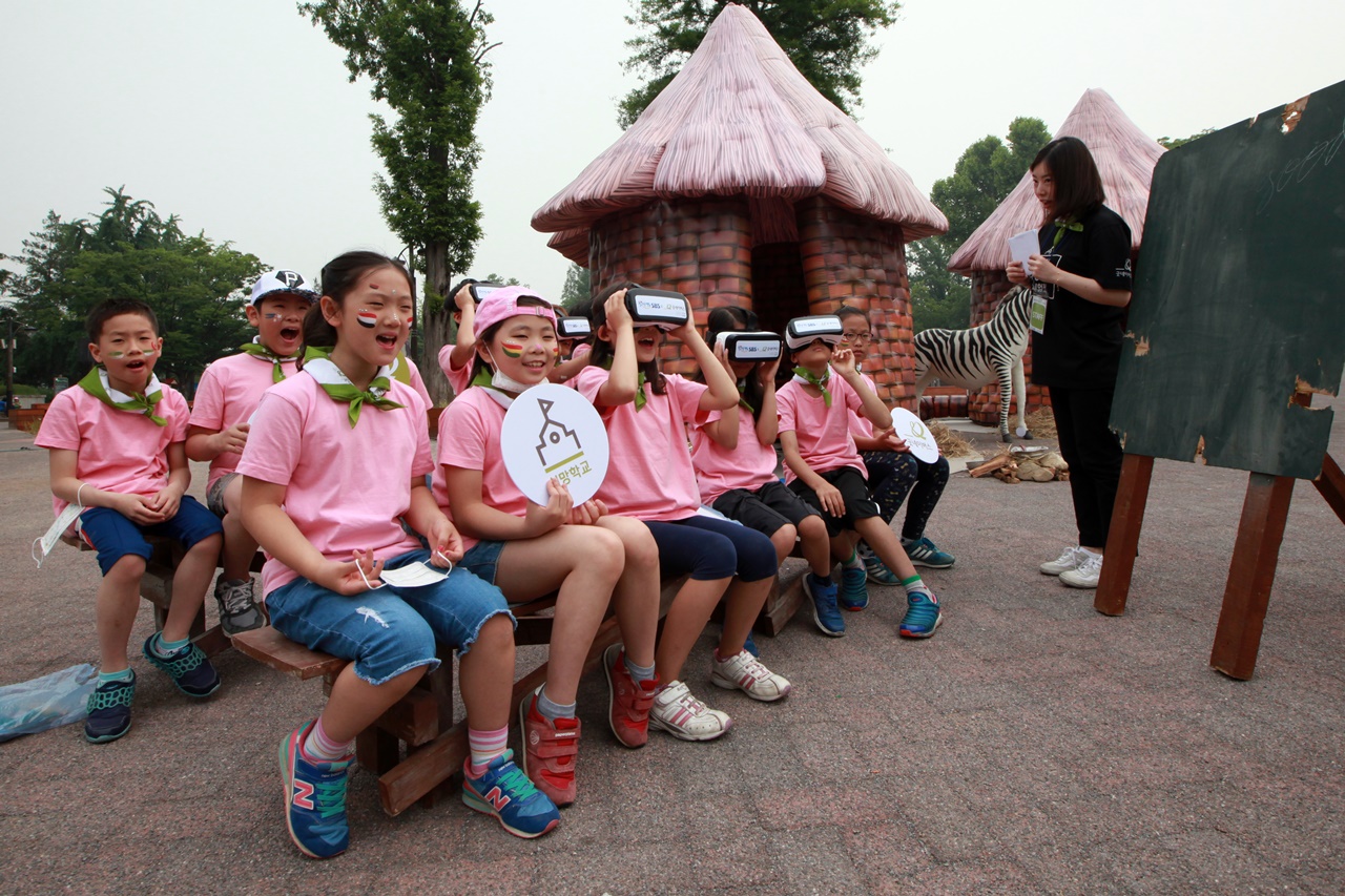 참여한 학생들이 VR영상을 통해 아프리카의 열악한 교육 환경을 경험하고 있다.
