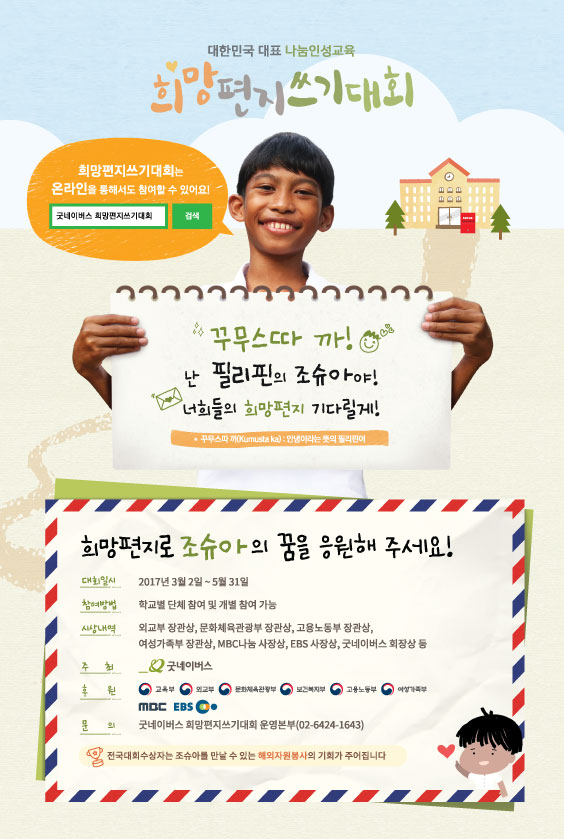 아동과 학부모가 함께 쓴 희망편지는 학교에 제출됨과 동시에 대회에 자동 참가신청 되며, 심사를 통해 선정된 전국대회 수상자는 해외 자원봉사활동을 통해 필리핀 조슈아에게 직접 희망편지를 전달할 예정이다.