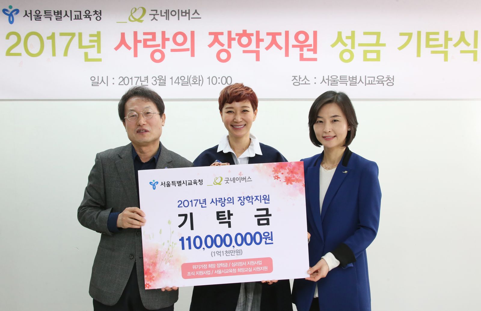 | ○ 14일, 굿네이버스-서울시교육청 ‘사랑의 장학지원 성금 기탁식’가져 ○ 굿네이버스, 서울시 위기가정 아동 복지 프로그램 지원 위해 1억천만 원 기탁 ○ 방송인 변정수, 나눔의 즐거움 전하며 세계시민교육‘좋은마음 인성학교’ 참여 독려해 |