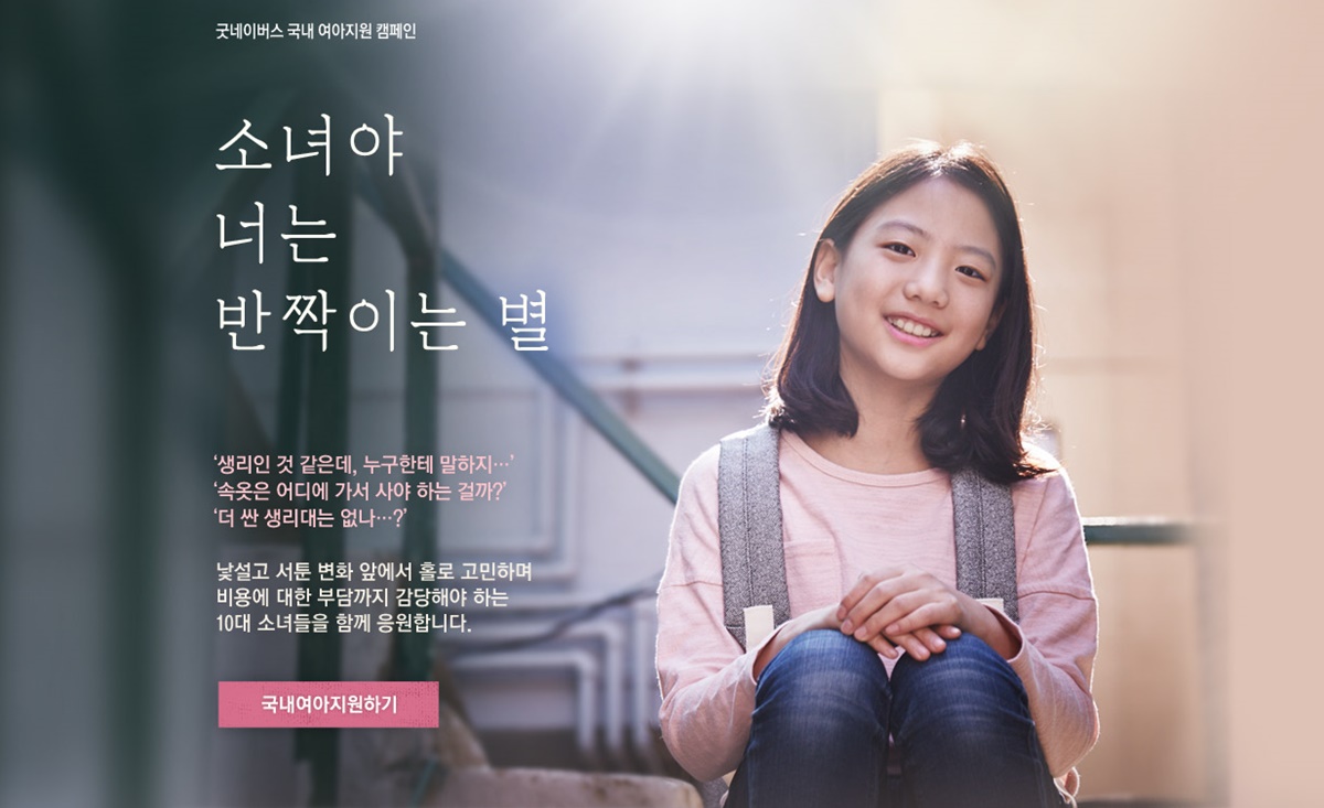 지난 해, 일명 ‘깔창 생리대’보도를 통해 국내 위기가정 여아들의 문제가 대두되었다. 이러한 문제를 해결하고자 굿네이버스는 ‘소녀야, 너는 반짝이는 별’캠페인을 시작했다. 2017년에도 빈곤 등의 상황으로 어려움을 겪고 있는 위기가정 여아들에게 도움의 손길을 전달하기 위해 캠페인을 진행한다.