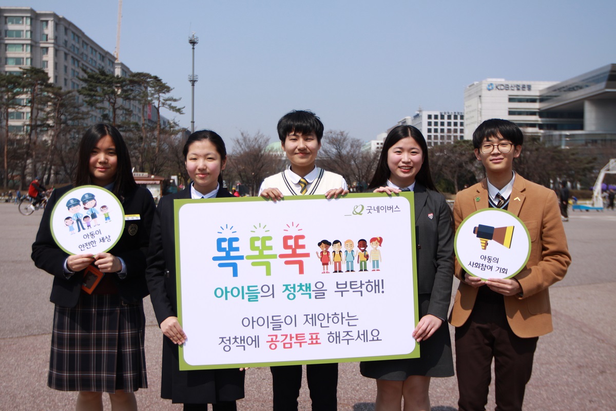 국제구호개발 NGO 굿네이버스(회장 양진옥, www.gni.kr)는 20일(목)부터 한 달간 네이버 해피빈에서 아동정책제안 캠페인‘똑똑똑, 아이들의 정책을 부탁해’를 진행한다.