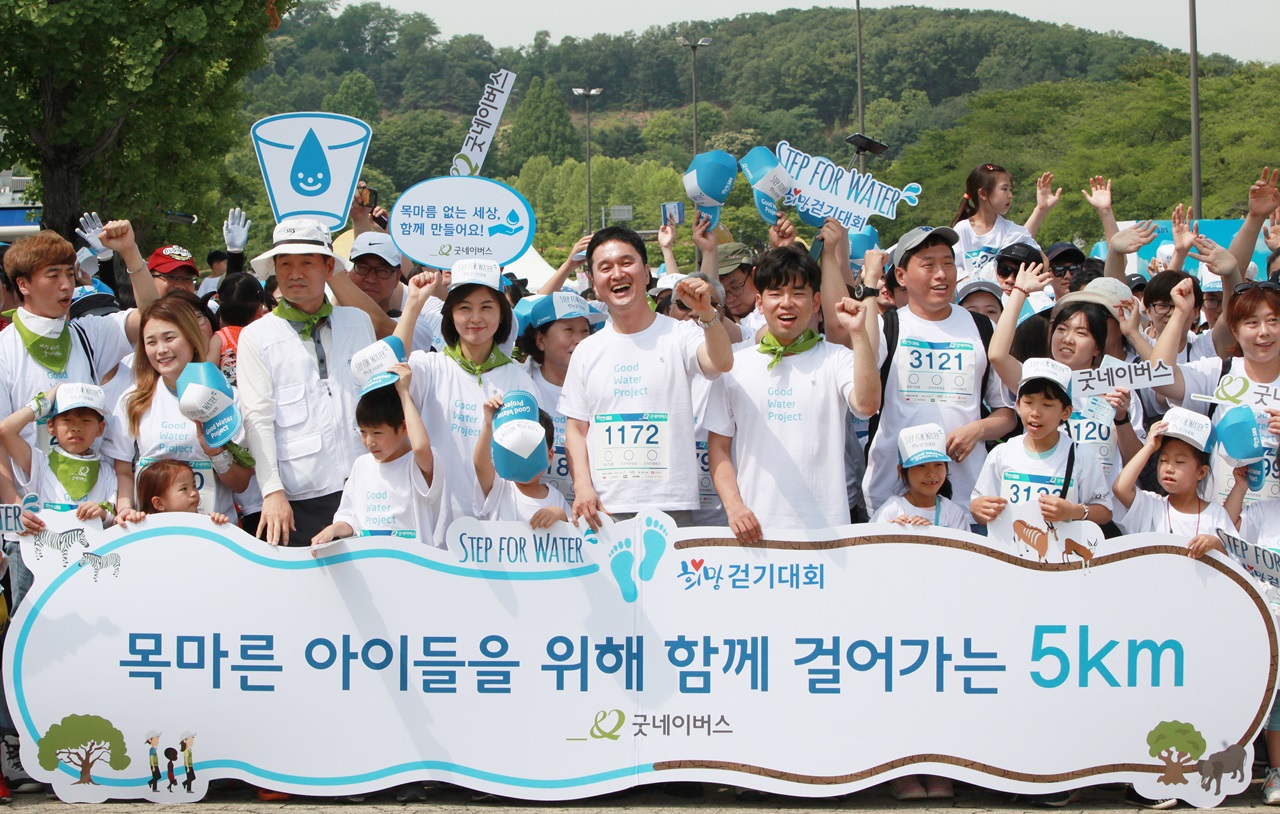 올해 처음 진행된‘굿네이버스 스텝포워터 희망걷기대회’는 식수 문제로 고통 받는 지구촌 이웃들의 일상을 체험을 통해 공감하며, 걷는 것만으로도 기부에 동참할 수 있는 쉽고 재미있는 나눔 활동이다. 이번 걷기대회 코스는 물을 구하기 위해서 하루 평균 5~6km를 걷고, 야생동물의 위협 등 안전하지 못한 길을 지나야 하는 아동들의 일상을 간접 경험해 봄으로서 지구촌 식수 문제를 이해할 수 있도록 구성됐다.