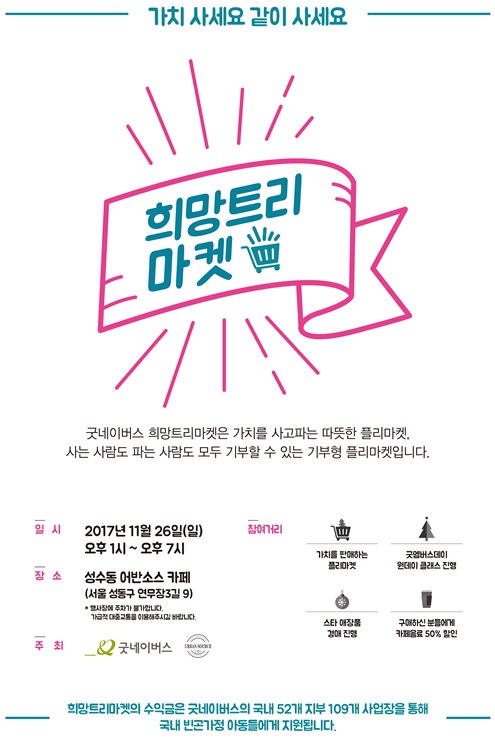 ‘희망트리 마켓’은 판매자와 소비자가 모두 기부에 동참할 수 있는 나눔 플리마켓으로 수익금은 굿네이버스를 통해 국내 위기가정아동을 지원하는데 사용된다. 이 행사는 26일 오후 1시부터 7시까지 어반소스 까페(성수동)에서 개최되며 크리스마스 용품, 악세사리, 리빙 및 패션 상품 등 다양한 중고 및 수공예 물품들을 판매한다. 행사에 참여하는 판매자들은 당일수익의 30% 이상을 기부한다.