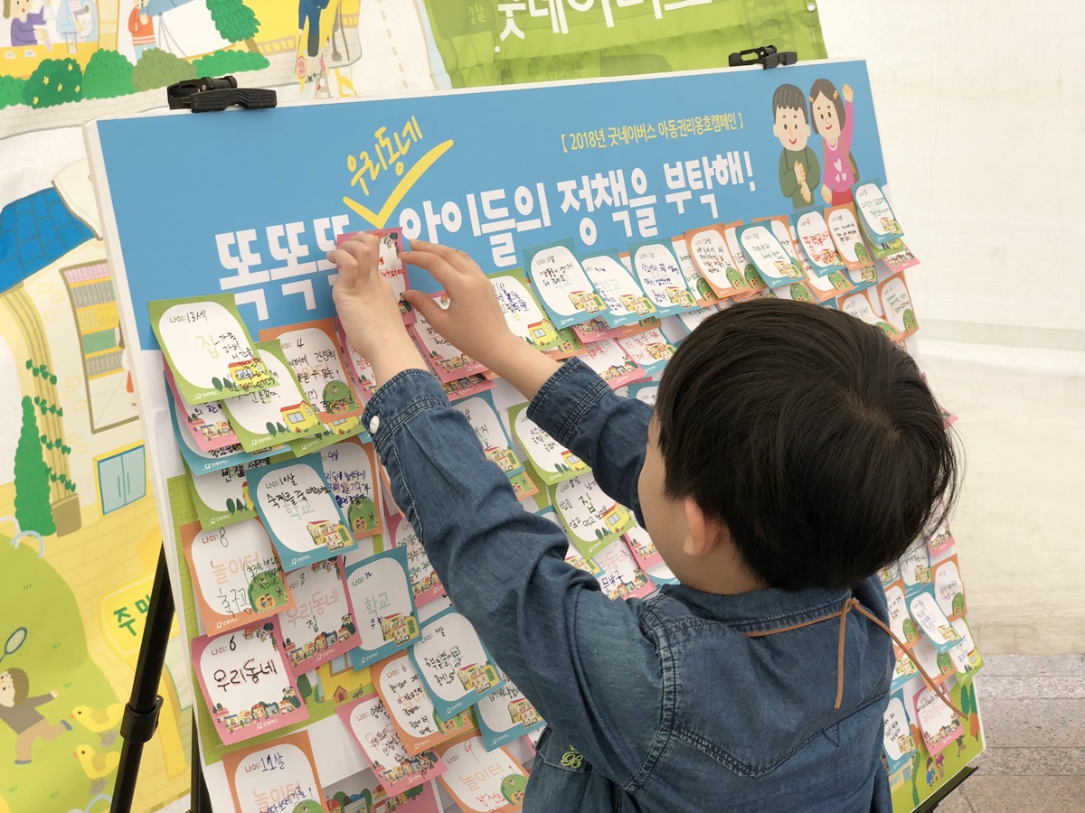 굿네이버스는 지난 5일 어린이날을 맞아 서울, 인천, 강원, 대전, 전북 등에서 진행된 오프라인 캠페인에서 각 지역별 아동권리 증진을 위해 아동의 4대 권리인 생존권, 보호권, 발달권, 참여권을 중심으로 각 지역에 필요한 정책 및 시설 등에 대해 아동들과 시민들의 의견을 접수 받았으며, 6월까지 전국에서 진행될 예정이다. 오늘(17일)부터는 네이버 해피빈 캠페인 페이지(campaign.happybean.naver.com/childvoice2018)를 통한 온라인 의견 접수도 함께 진행한다. 이번 네이버 해피빈 캠페인에는 신한카드의 사회공헌 브랜드인 신한카드 아름인과 조선일보의 공익섹션인 더나은미래가 함께 한다. 온라인 캠페인 참여자에게는 기부를 할 수 있는 해피빈 콩이 지급되며, 참여 건당 300원이 매칭 기부된다.