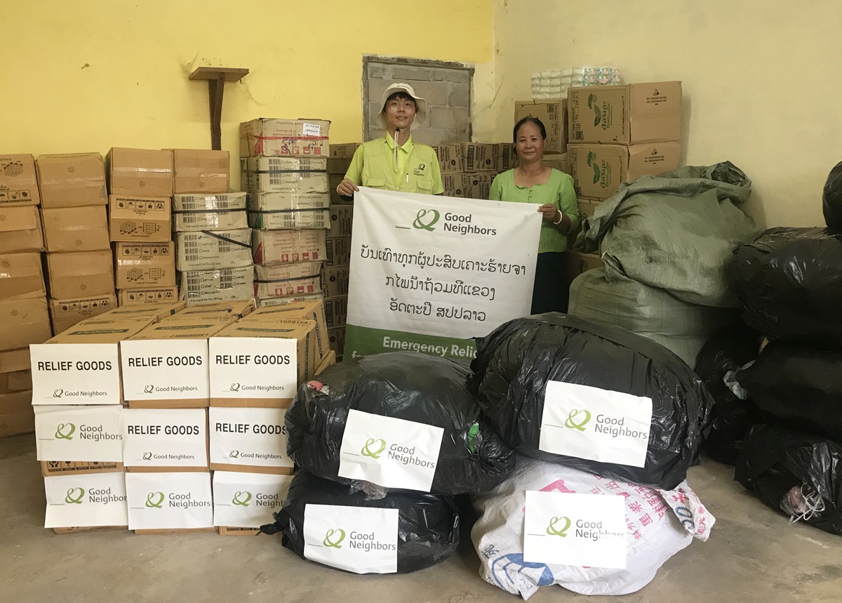 UN보고서(29일 기준)에 따르면 수해로 인해 사망한 사람은 19명, 실종자는 191명이며, 홍수로 인해 피해를 입은 주민은 약 1만6천여 명에 이르는 것으로 집계되고 있다. 현재 라오스에서는 주 정부에서 긴급구호물품 접수 및 배분을 일괄 관리하고 있다. 이에 굿네이버스는 지난 29일, 1차로 아타프 주 세남사이 군 지역의 여성 및 아동 약 3천2백여 명에게 배분 가능한 여성용품 및 속옷 등으로 구성된 위생키트를 주 정부에 전달했으며, 30일에 2차로 약 3천3백여 명분의 치약과 칫솔, 비누 등을 전달했다. 굿네이버스는 이후, 주 정부의 배분 현장 모니터링을 통해 주민들에게 물품이 적절하게 잘 전달되는지를 함께 확인할 예정이다.