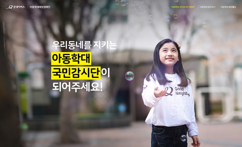 이에 굿네이버스는 우리 주변의 학대피해아동을 발견, 보호하고 학대위험으로부터 지킬 수 있도록 아동학대예방캠페인 ‘아동학대 국민감시단’을 실시한다. 이번 캠페인에서는 지역별 아동학대 현황을 확인하고, 우리 주변 아동학대 근절을 위한‘아동학대 국민감시단’으로 참여할 수 있다.
