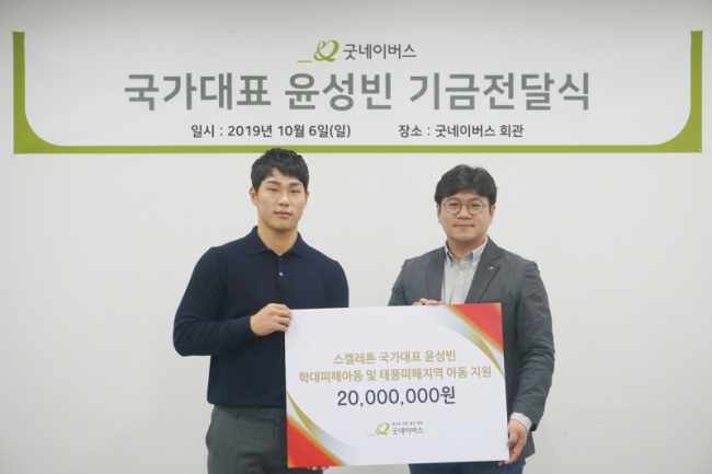 지난 6일, 굿네이버스 회관에서는 윤성빈 선수와 굿네이버스 황성주 본부장 등이 참석한 가운데 후원금 전달식이 진행되었다. 이날 윤성빈 선수가 굿네이버스에 전달한 후원금 2천만 원은 학대피해아동의 심리치료와 제17호 태풍 ‘타파’로 피해를 입은 지역의 아동을 돕기 위해 사용될 예정이다.