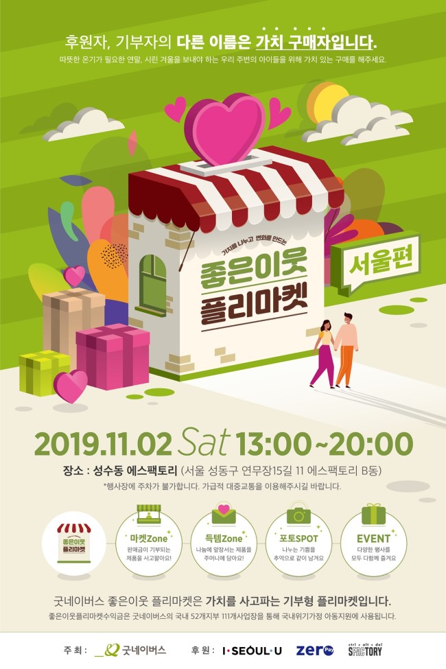 ‘좋은이웃 플리마켓’ 서울편은 오는 11월 2일(토) 성수동 에스팩토리 B동에서 오후 1시부터 오후 8시까지 진행된다. 추첨을 통해 굿네이버스가 준비한 럭키박스 및 스타들의 애장품을 받을 수 있는 다양한 즐길 거리도 마련된다.