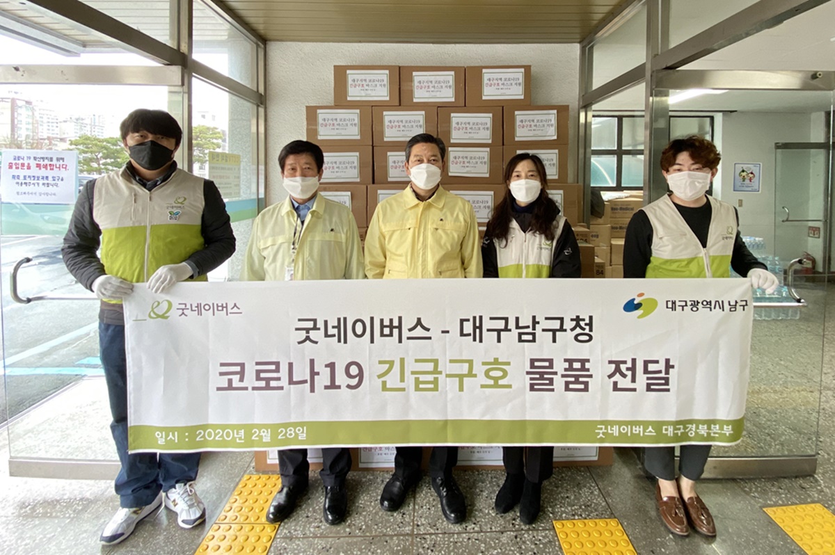굿네이버스 대구경북본부는 지난 2월 27일과 28일 양일에 걸쳐 대구광역시교육청에 마스크 1만 6천여 장과 손 세정제 100개, 대구광역시 남구청 및 대명11동 행정복지센터에 마스크 1만 9천 장을 전달했다. 앞으로도 굿네이버스는 코로나19 확산 추이에 따라 지역사회와 긴밀하게 협의하여 전국 11개 굿네이버스 시도본부를 통해 감염 예방 물품과 긴급 생필품을 추가 배분할 계획이다.