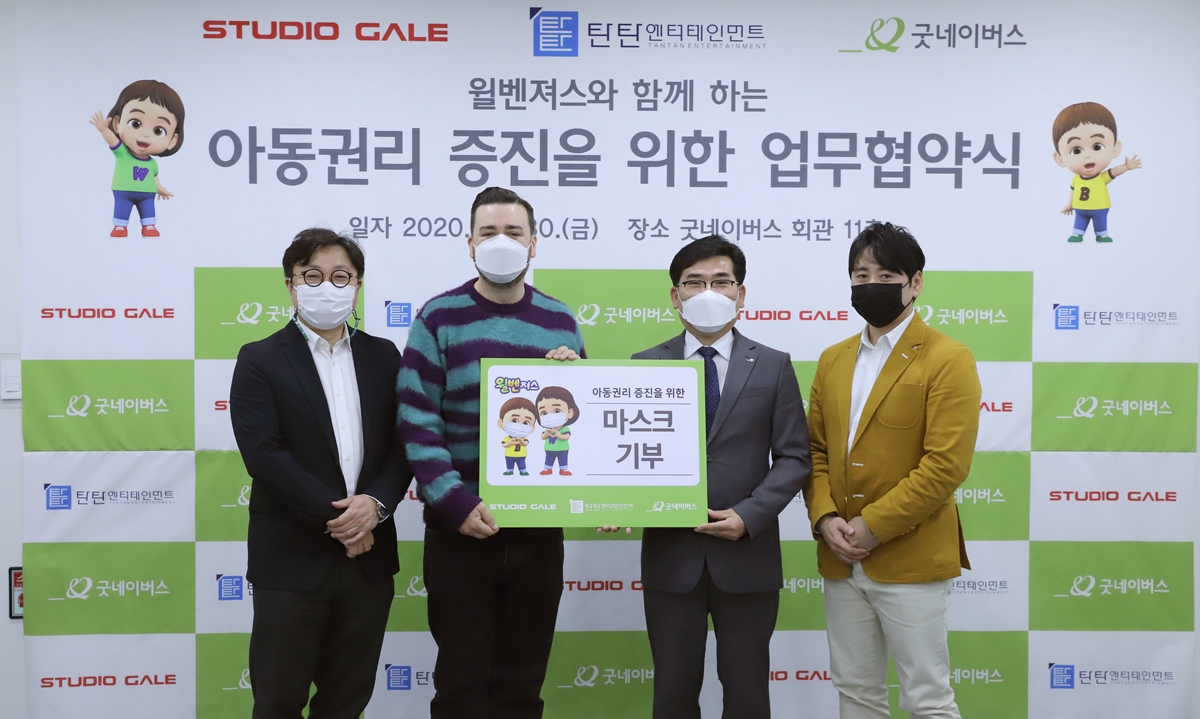 협약식에는 김웅철 굿네이버스 사무총장, 방송인 샘 해밍턴, 신창환 스튜디오게일 대표, 박원용 탄탄엔터테인먼트 이사가 참석했다.