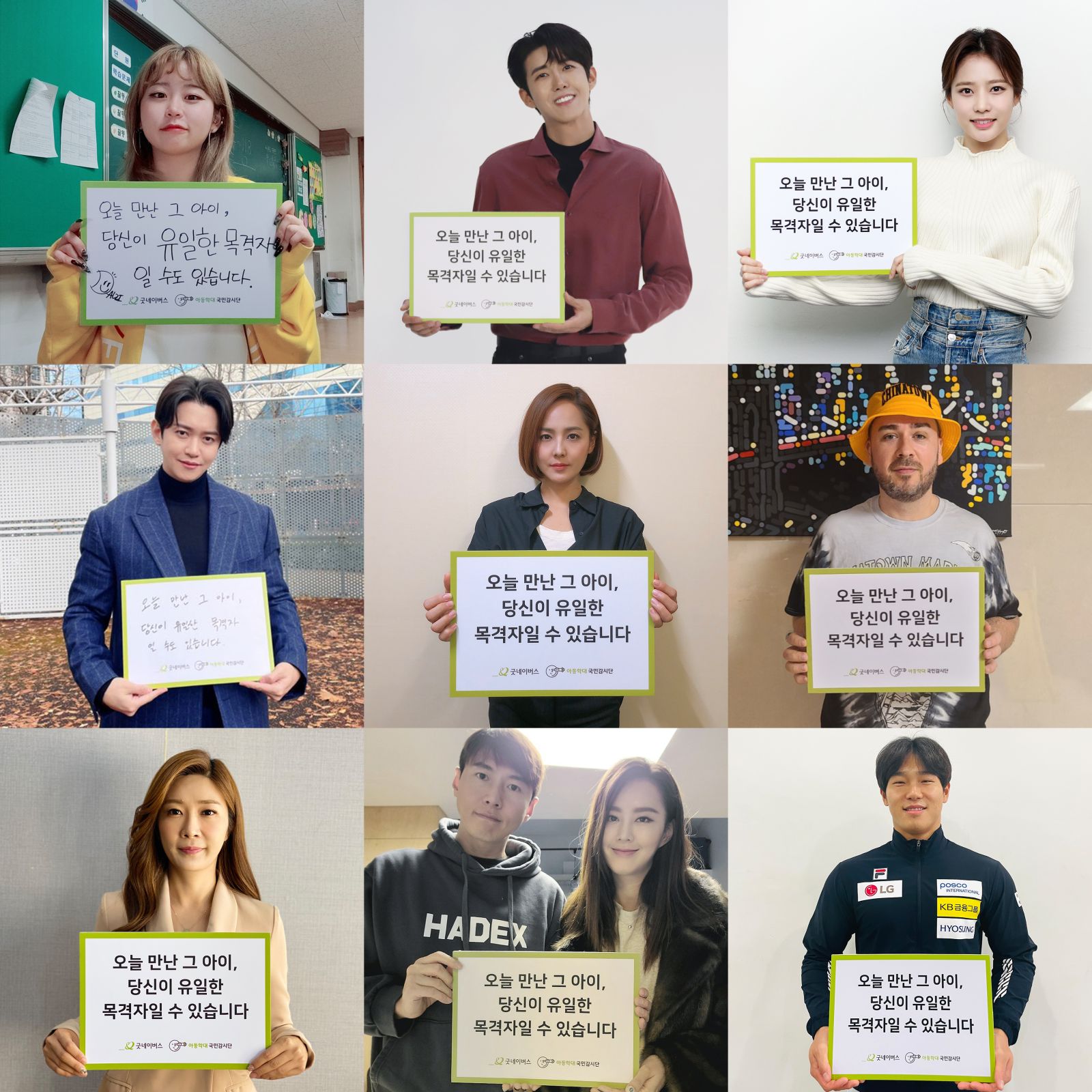 이번 캠페인에는 학대피해아동의 보호를 위해 배우 유진, 송재희 지소연 부부, 남이안, 가수 강균성, 방송인 샘해밍턴, 황광희, 아나운서 이정민, 스켈레톤 국가대표 윤성빈, 유튜버 달지 등 셀럽의 참여가 활발하게 이어졌다.