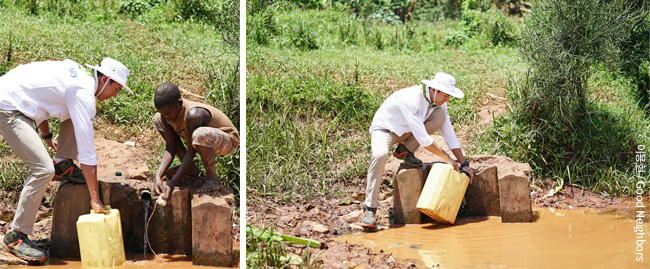 먼저, 송재희 씨는 에티엔과 함께 아침 일찍 일거리를 구하러 나갔습니다. 이웃집을 들러 일을 구해봤지만 대부분은 거절하고 한 집에서 일거리를 주었습니다. 왕복 4km의 험한 비탈길을 지나 20L의 물을 떠오는 일입니다. 험한 산길을 신발도 없이 약 20kg의 무거운 물통을 들고 걷는 에티엔의 모습에 송재희 시는 할 말을 잃었습니다.