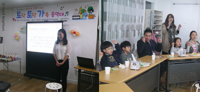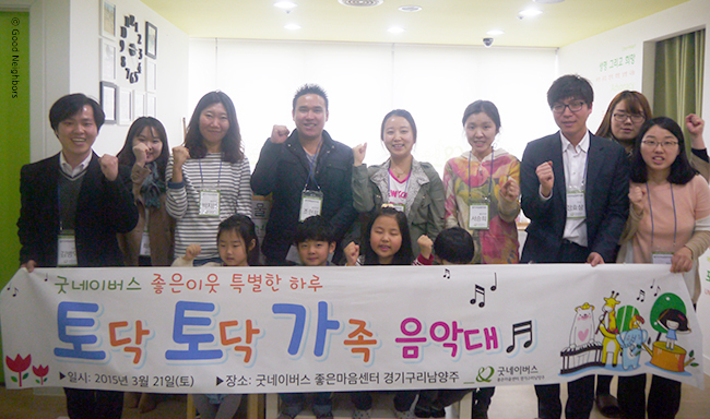 좋은이웃 회원님들이 자녀와 함께 더욱 특별한 하루를 같이 보내기 위해 굿네이버스 경기구리남양주지부를 방문했습니다. 이제 막 초등학교에 입학하는 자녀들의 사회성을 향상시키고 즐거운 추억을 만들어 주기 위해 다양한 회원님들이 모였는데요. 경쾌한 음악소리가 가득했던 ‘토닥 토닥 가족음악대’, 그 특별한 하루 이야기를 시작합니다!