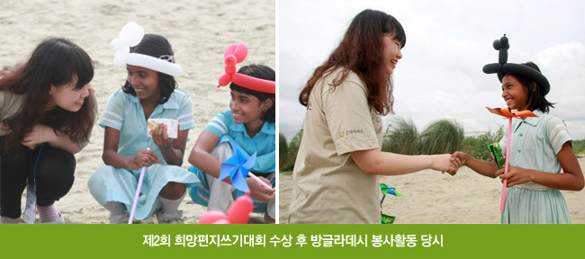 저는 제2회 희망편지쓰기대회를 통해 방글라데시에 있는 수존을 직접 만나고 봉사활동을 했습니다.