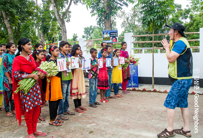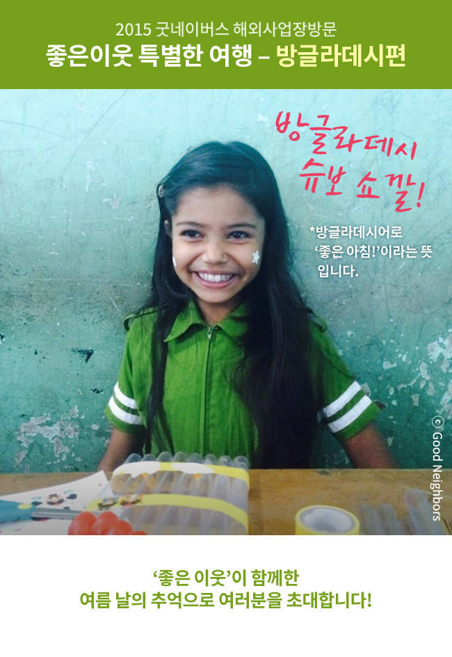 2015년 7월 뜨거운 여름! 12명의 좋은이웃 회원님들이 부푼 기대를 안고 방글라데시로 특별한 여행을 떠났습니다. 도착하자마자 마음을 다해 반겨주는 아이들의 열렬한 환대에 회원들도 흥겨운 춤으로 화답하며, 특별한 여행이 시작 되었습니다.