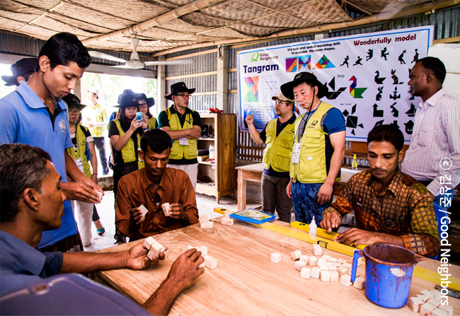 제일 먼저 들른 곳은 시라즈간지(Sirajganj)사업장의 소득증대사업이 한창 진행되고 있는 곳이었는데요. 소득증대 사업에 대한 자세한 소개도 듣고, 방글우드 큐브를 만들면서 직접 사업을 체험하고, 이해하는 시간을 가졌습니다.