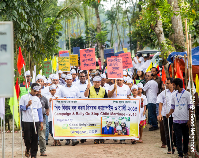 방글라데시는 조혼률이 높은 나라 중 하나인데요. 여자 아이들을 보호하고, 삶을 스스로 선택할 수 있는 권리를 찾아주기 위해 지역아동 300여명과 지역자치단체장, 경찰서장 등 지역인사들과 함께 조혼방지캠페인에 참여하였습니다. 굿네이버스의 도움으로 조혼을 피하게 된 아동의 스피치와 경찰서장의 조혼방지 대책을 듣고, 다함께 손을 잡고 거리로 나갔습니다. 이 캠페인을 통해서 아동의 권리에 대해서 다시 한 번 생각해보고, 홀로 목소리를 낼 수 없는 아동들을 위해 좋은이웃들이 더욱 아동들의 권리를 대변해줘야겠다는 다짐을 하게 되었습니다.