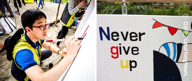 시간이 갈수록 특별한 여행은 열기를 더해 갔는데요, 셋째 날엔 지역아동과 주민들이 주민센터로 이용하는 시라즈간즈(Sirajganj) 사업장 건물 한 쪽 벽면에 희망을 전하는 메시지를 담은 9행시를 지어 그림을 그렸습니다. 비가 오는 궂은 날씨에도 지역아동들과 함께 즐겁게 벽화를 그리며, 마음을 다해 아이들의 꿈을 응원하였습니다.