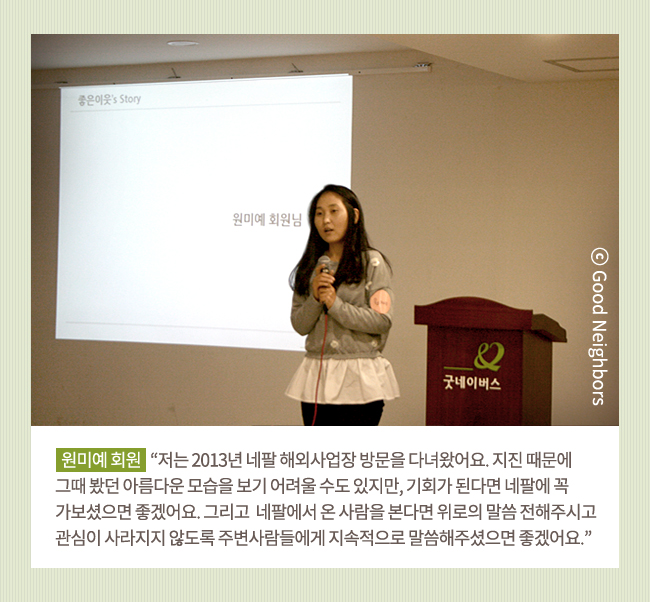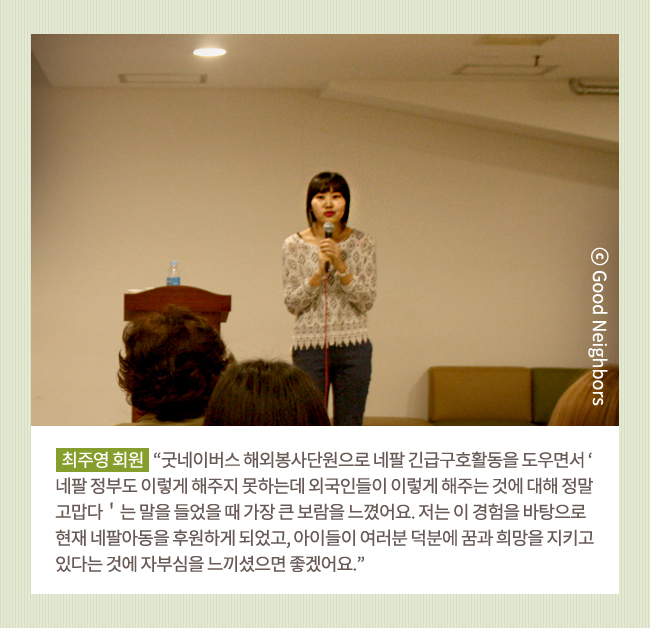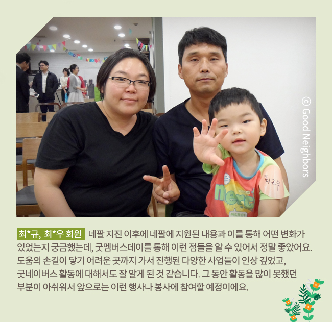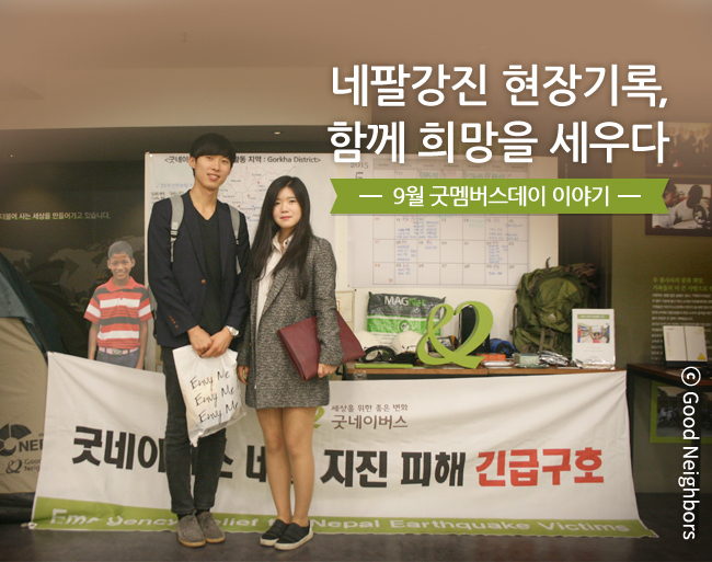 긴박했던 순간들과 이후의 재건활동, 그 곳에서 만난 사람들에 대해 알 수 있었던 9월의 굿멤버스데이 ‘네팔강진 현장기록, 함께 희망을 세우다’ 이야기를 지금 시작합니다.