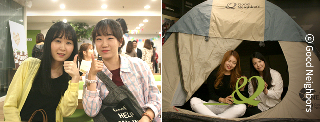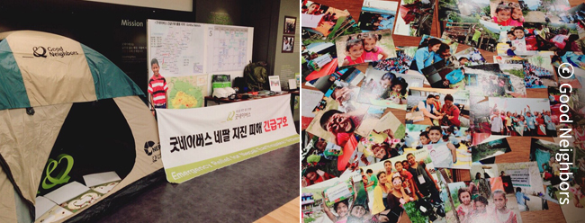 행사를 위해 라운지에는 긴급구호 활동에 사용되는 물품과 큰 재난을 경험하고도 희망을 잃지 않는 네팔 아이들의 사진을 담은 엽서가 준비되었습니다. 회원님들은 긴급구호물품과 엽서를 보며 생생한 현장을 떠올리는 시간을 가졌습니다.