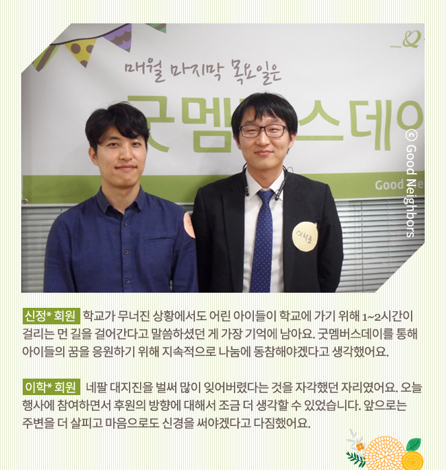 굿네이버스 직원들이 마치 ‘영웅’ 같았다던 지역주민과 아이들의 이야기가 인상 깊었다고 합니다.