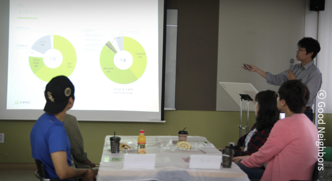 ‘굿네이버스에서는 어떤 국내 사업을 진행하고 있을까?’, 궁금증을 가진 회원님들을 위해 굿네이버스의 국내 사업과 방화2종합사회복지관에 대해 알아보는 시간을 가졌습니다. 참여한 회원님들 모두 귀를 쫑긋 세우며, 기관소개에 집중하는 모습을 보였습니다.