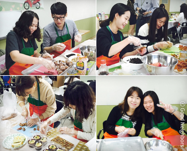 특별한 도시락의 메뉴는 호두 곶감말이와 모닝빵 컵 샌드위치! 회원님들은 삼삼오오 모여 앉아 서툴지만 정성어린 손길로 오늘의 메뉴를 만들기 시작했습니다. 어르신들께 맛있는 음식을 전달하고자 하는 회원님들의 열정은 점심이 훌쩍 지난 시간까지 이어졌습니다. 결국 준비된 모든 재료를 이용해 예정보다 더 많은 양의 도시락을 만들게 되었습니다. 그 덕에 복지관에 나들이 오신 다른 어르신들께도 맛있는 도시락을 대접할 수 있었습니다.