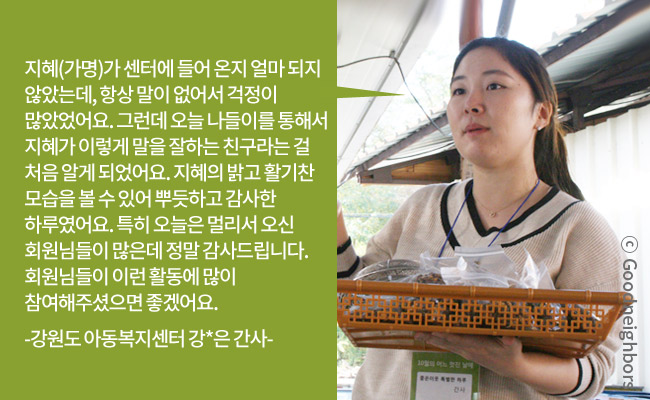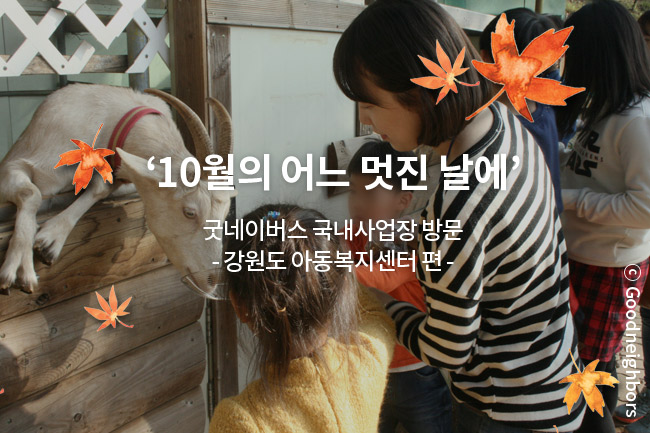 이른 새벽 내린 보슬비 때문인지 유난히도 청명하고 푸르렀던 10월의 어느 토요일. 울긋불긋 아름답게 물든 강원도에 아이들과 소중한 추억을 남기기 위한 회원님들의 방문이 이어졌습니다.