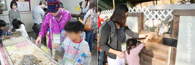 레일바이크로 한껏 신난 아이들과 함께 곤충마을에 방문하였습니다. 선생님이 설명해주시는 곤충들의 일대기를 들으며 직접 장수풍뎅이를 만져보기도 하였는데요. 용감한 아이들의 모습에 회원님들이 엄지를 치켜세웠다고 하네요! 이후엔 토끼와 산양에게 직접 먹이를 주기도 하였습니다. 평소에 책으로만 보던 산 속 곤충, 동물들을 직접 만나게 되어 모두들 신기해하였습니다.