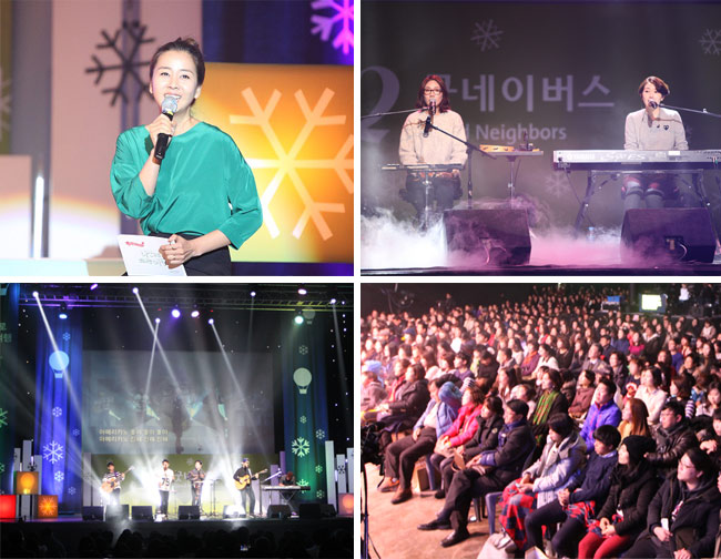 방송인 전제향 씨의 사회로 콘서트가 시작되었습니다. 10cm의 신나는 공연에 이어 루사이트 토끼와 옥상달빛이 아름다운 노래들로 관객들의 마음을 사로잡았습니다. 회원님들의 사연 소개와 행운권 추첨으로 공연장의 열기는 더욱 뜨거워졌습니다. 아동보호전문기관 현장의 모습이 생생하게 담긴 다큐멘터리를 통해 관객들은 굿네이버스의 사업을 더욱 깊이 이해할 수 있는 시간을 가졌습니다. 곧이어 가수 김장훈 씨의 등장으로 공연장은 다시 들썩이기 시작했습니다. ‘공연의 신’이라는 별명답게 신나는 퍼포먼스로 등장한 김장훈 씨는 지난 4월 희망TV SBS를 통해 굿네이버스 케냐 지부로 봉사활동을 다녀왔습니다. 케냐를 떠올리며 그 때의 감동을 전한 김장훈 씨는 함께하는 좋은이웃들에게 감사의 마음을 전했습니다. 한편 부산에서는 가수 이기찬 씨가 겨울에 어울리는 따뜻한 곡들로 콘서트의 대미를 장식했습니다.