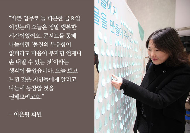 2014년 12월, 바쁜 일상 속에서도 따뜻한 나눔을 실천하며 지낸 좋은이웃 회원님이 소중한 사람들과 함께 “나눔으로 여행”을 떠났습니다. 무려 1,500여 명의 사람들이 ‘나눔’이라는 공통점 하나로 한 자리에 모였는데요, 공연 전 로비에 마련된 부스에서 세계 곳곳의 굿네이버스 해외사업국을 직접 체험하고, 굿네이버스 해외사업을 경험하는 시간을 가졌습니다.