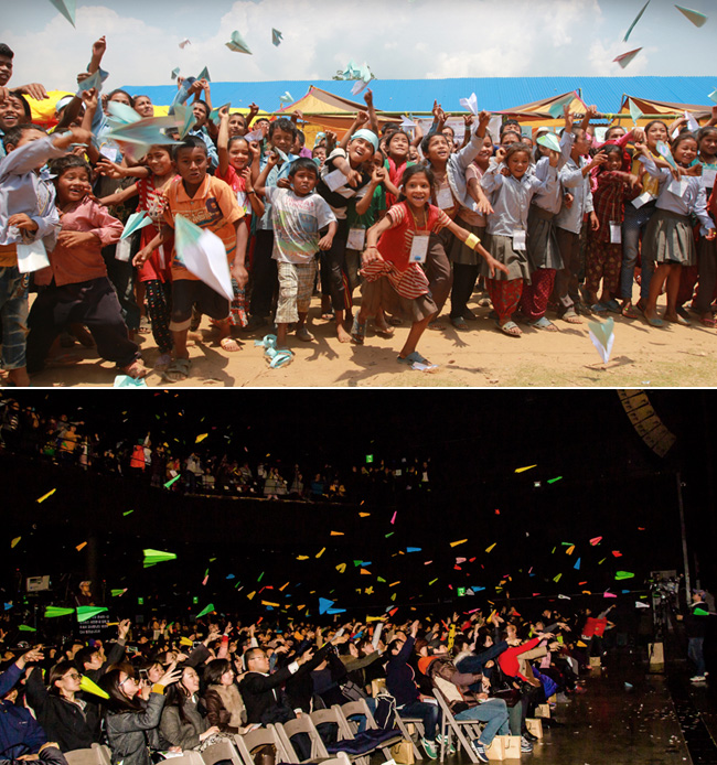 마지막 순서는 네팔 아동들의 사진과 함께 했습니다. 올해 4월 지진으로 큰 피해를 입은 네팔의 아이들이 심리정서 지원을 위해 운영된 '아동친화공간'에서 종이비행기를 날리는 모습인데요. 좋은이웃 콘서트를 찾아주신 회원님들과 네팔의 아이들이, 그리고 국내외 모든 빈곤 아동들이 꿈을 이어 갈 수 있도록, 응원하는 우리의 마음을 담아 종이비행기를 날리며 콘서트를 마무리 지었습니다.