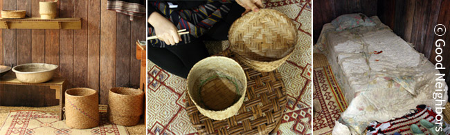 나무로 엮어 만든 이 그릇들은 라오스에서 직접 가져온 바구니인데요. 이 그릇에 밥을 담아 먹기도 하고,