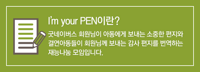2016년 올 한 해, 지구 반대편에 있는 아이들의 마음과 후원자님의 마음을 이어주는 소중한 통로가 될 I’m your PEN 7기의 첫 만남 시간을 지금부터 함께 보실까요?