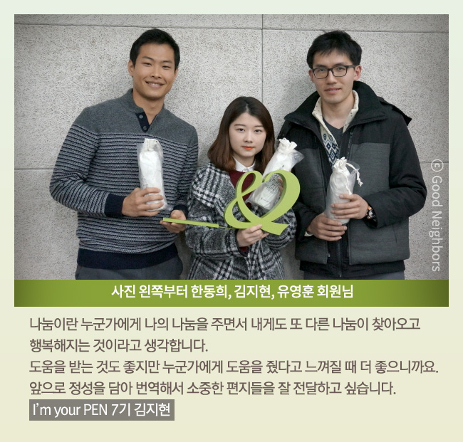 2016년 가장 보람찬 다짐을 하는 I’m your PEN 7기의 모습 속에서 회원님과 아이들의 마음을 따뜻하게 이어주고자 하는 마음이 느껴졌습니다.