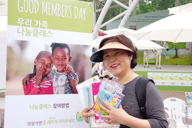 ‘띵동! 굿멤버스데이에 회원님을 초대합니다’ 굿네이버스에서 온 문자를 받고 어린이대공원까지 오신 김*금 회원님! 굿네이버스 후원을 시작하시게 된 이유를 여쭤보니 내 자녀는 다 키웠으니 이제는 형편이 어려운 이웃에게 나눔을 실천하고 싶었는데 마침 굿네이버스에서 결연아동 1:1후원을 할 수 있다는 소식을 알게 되어 또 다른 자녀를 키우는 마음으로 후원을 시작하셨다고 합니다. 양손 가득 준비해온 학용품에선 어려운 지역에 살고 있는 아동들을 향한 따뜻한 사랑이 느껴졌습니다.