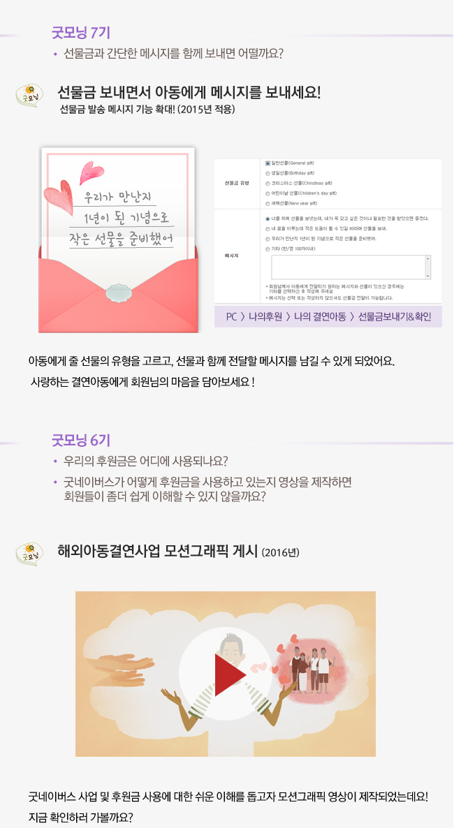 회원님들의 다양하고 애정어린 의견들이 모여 굿네이버스는 성장하고 있습니다. 회원님들의 목소리가 어떤 변화들을 만들어오고 있는지 지금 함께 만나볼까요?