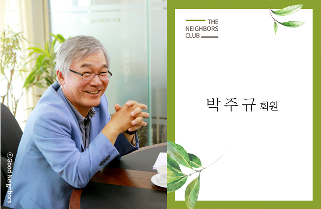 사회적으로 안정적인 성공을 이루고, 끊임없이 이웃과 세상을 향해 따뜻한 시선을 보내는 박주규 회원. 자신의 나눔 활동을 혼자 실천하는 데 그치지 않고, 많은 이들에게 전하고자 노력하는 박주규 회원을 만나고 나눔은 서로를 보듬는 작은 관심, 희망을 응원하는 따뜻한 시선에서 시작되는 것이라는 걸 알게 됩니다. 박주규 회원이 이어가는 나눔의 길에 굿네이버스도 함께하겠습니다.