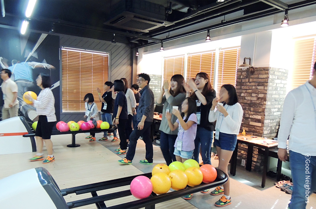 볼링 치는 법을 가르쳐 주며 서로 더 친해지고~ 아이들과 함께 같은 팀을 응원하면서, 묵혀있던 스트레스도 해소하고 서먹함과 어색함도 날려버릴 수 있었습니다.