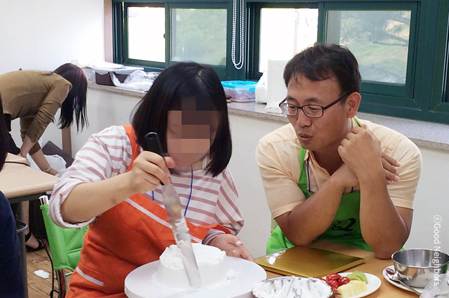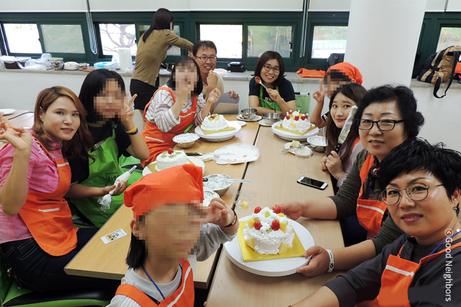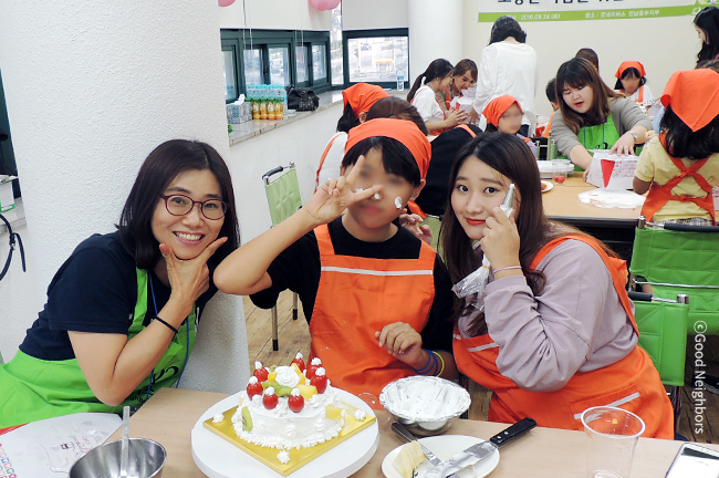 케이크 가게 진열장에 바로 진열해서 판매해도 될 것 같은 예쁜 케이크들이 완성되었습니다. 완성된 케이크와 함께 웃으며 기념 촬영! 기관에 있는 아이들과 좋은 이웃 회원님 모두 케이크의 달콤함과 행복을 함께 느끼는 시간이 되었겠죠?