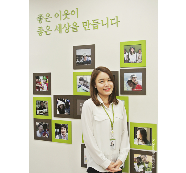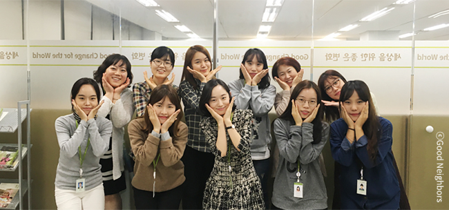 안녕하세요, 굿네이버스 회원상담센터에서 근무하고 있는 김애진입니다. 2008년에 입사해서 8년째 굿네이버스 회원상담 업무 진행하였고, 현재는 회원상담센터 매니저로 일하고 있습니다.