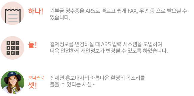 - 쉽고 간편하게 ARS로 기부금을 내가 원하는 방식(우편, FAX 등)으로 신청할 수 있어서 편리했어요.