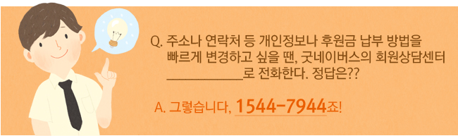 회원응대시스템 도입을 통해 좋은 이웃 회원님들이 굿네이버스 상담센터 1544-7944로 전화하시면 더욱 편리해진 서비스를 이용하실 수 있게 되었습니다.