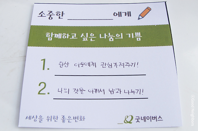 그림과 나눔약속 작성하기를 통해 나눔의 의미를 기억하는 좋은 이웃 회원님들이 앞으로도 소중한 나눔을 실천하는 ‘Good Neighbors’가 되길 기대해봅니다.